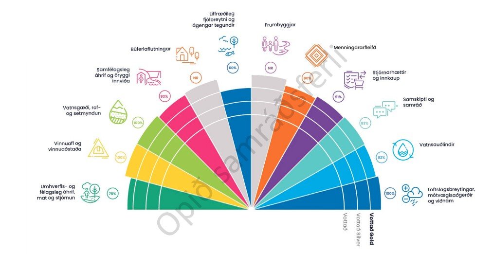 Hér fyrir neðan fylgir skýringarmynd af niðurstöðum matsskýrslunnar. Samkvæmt matinu uppfyllir undirbúningsstig verkefnisins allar lágmarkskröfur HSS staðalsins. Að óbreyttu gefa niðurstöður sem taka mið af ítarlegri kröfum staðalsins til kynna að verkefnið nái gull-viðmiðum staðalsins og sé vottunarhæft sem slíkt.